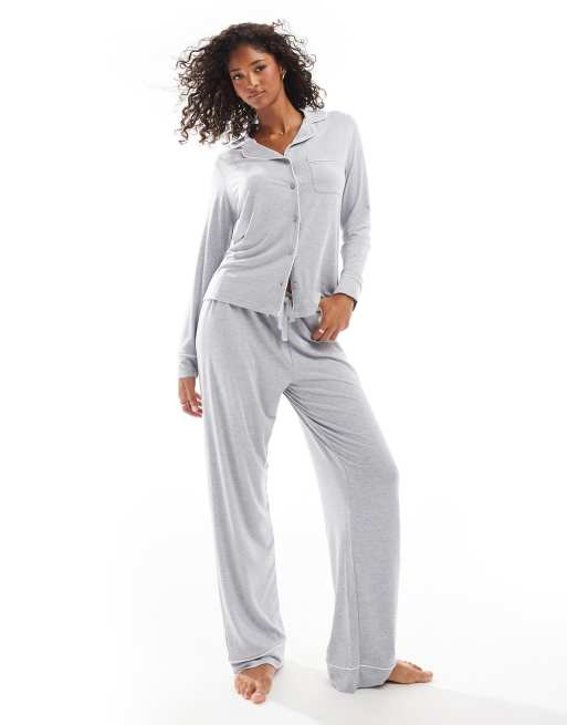 ASOS DESIGN super soft long sleeve shirt & pants pyjama set with contrast piping in grey marl