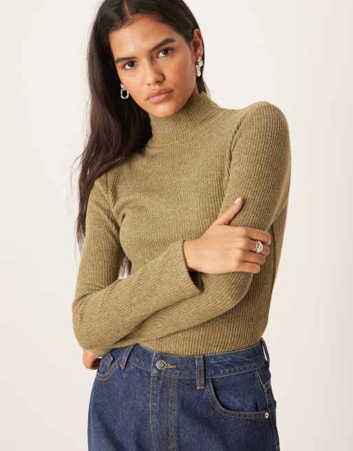 ASOS DESIGN supersoft brushed rib long sleeve roll neck top in dark olive