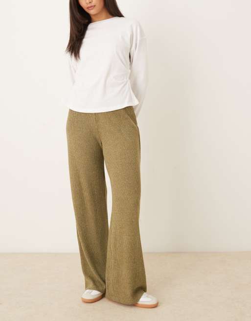 ASOS DESIGN supersoft brushed rib wide leg pants in dark olive (part of a set)