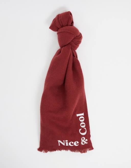 ASOS DESIGN supersoft long woven scarf with raw edge with slogan embroidery in burgundy