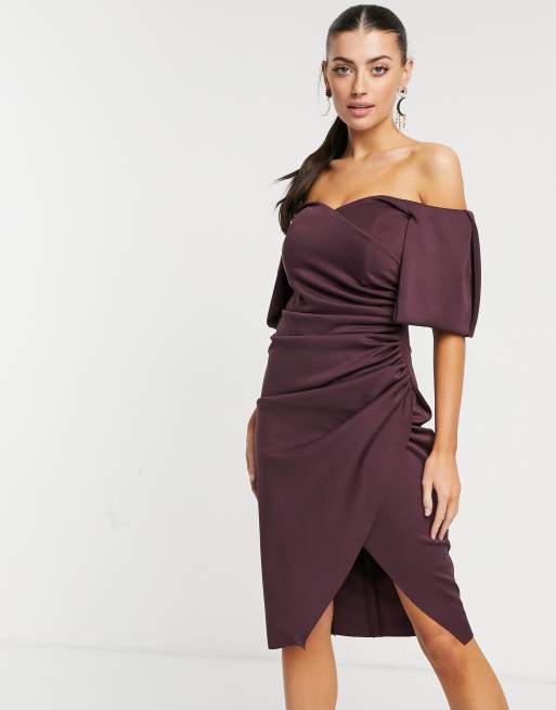 ASOS DESIGN sweetheart neck wrap tuck off-the- shoulder bardot midi dress in plum