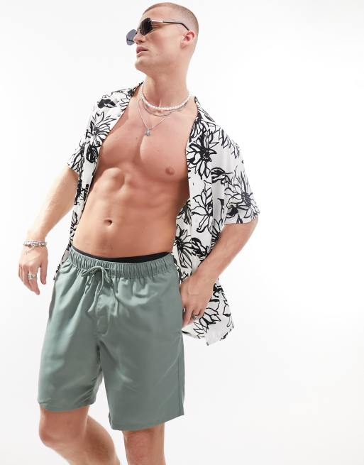 ASOS DESIGN swim shorts in mid length in khaki