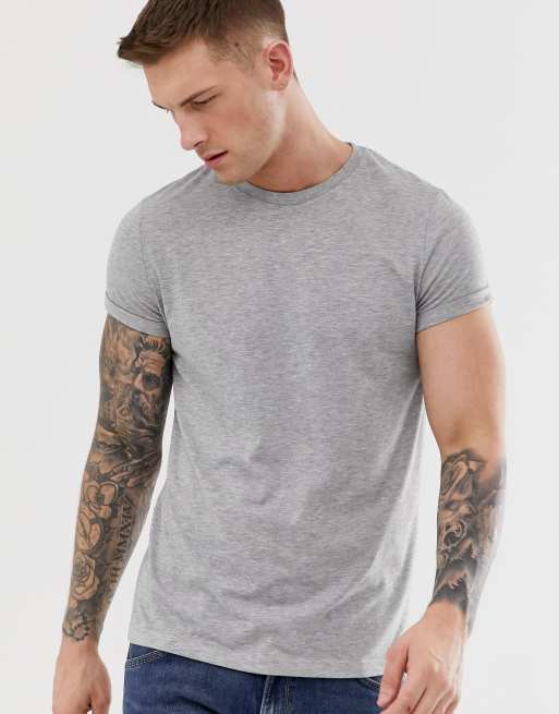 ASOS DESIGN t-shirt with crew neck and roll sleeve in grey marl