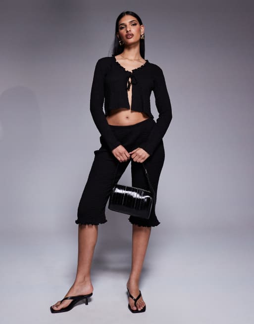 ASOS DESIGN texture ruffle edge long sleeve top and capri pants set in black