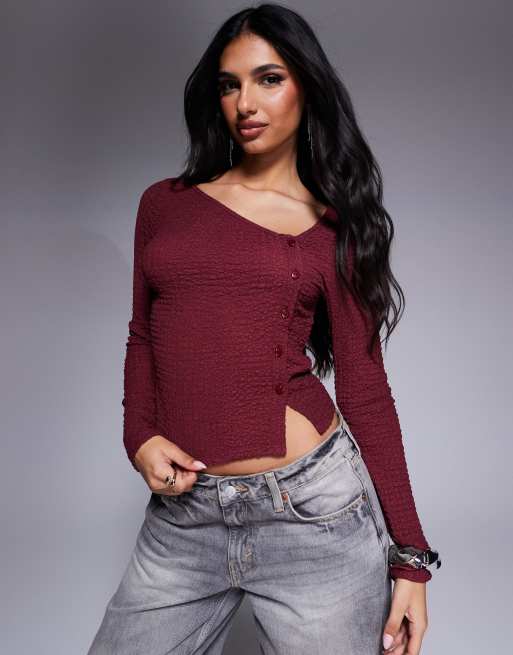 ASOS DESIGN textured asymmetric neck button up long sleeve top in burgundy