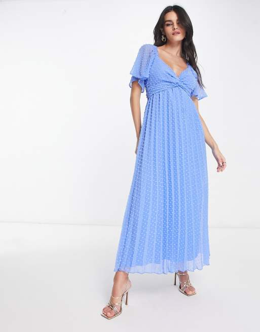 ASOS DESIGN tie front angel sleeve dobby midi dress in cornflower blue