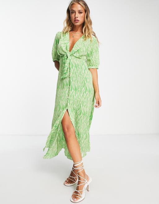 ASOS DESIGN tie front button through midi dress in green animal print