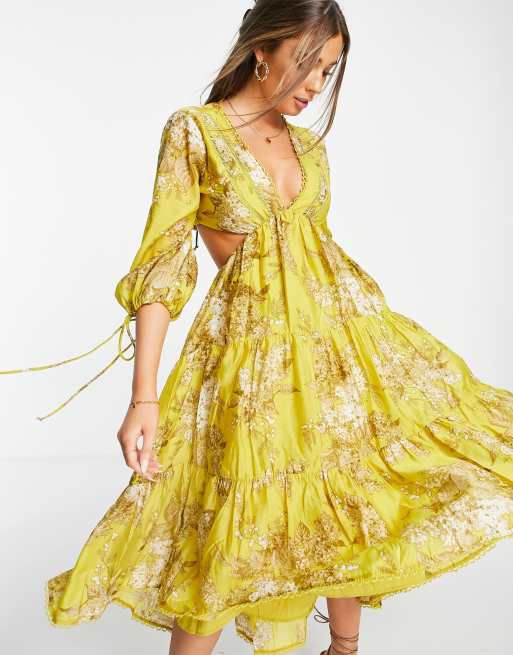 ASOS DESIGN tiered voile midi dress with lace trim in wisteria blossom print