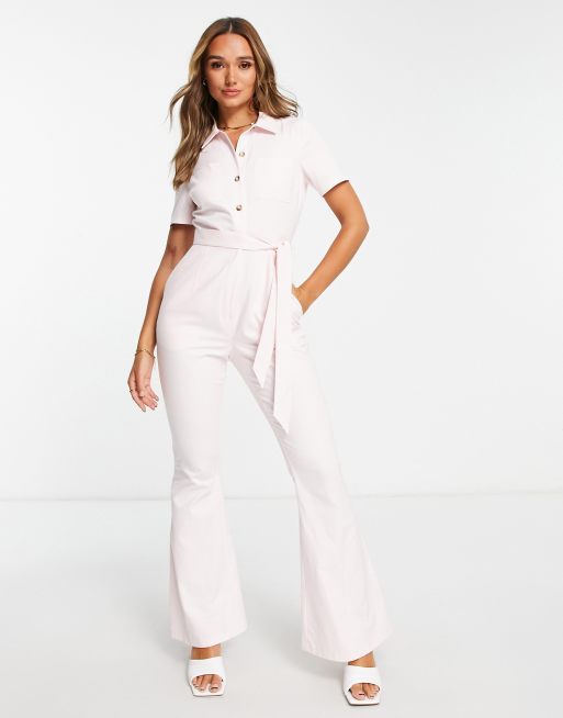 ASOS DESIGN twill 70s kickflare boilersuit in pale pink