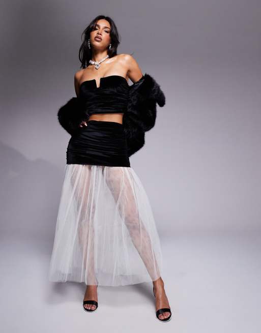 ASOS DESIGN velvet ruched bandeau top with trim and skirt set in black