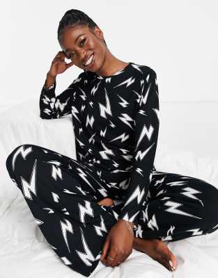 ASOS DESIGN viscose lightning bolt long sleeve top & pants pyjama set in black