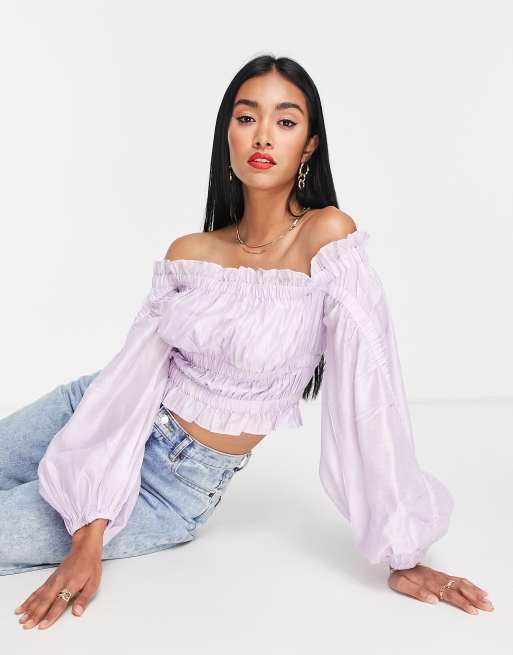 ASOS DESIGN volume sleeve crop top with elastic detail waist in lilac