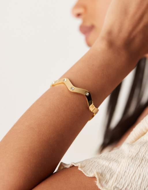 ASOS DESIGN waterproof stainless steel bangle in waved design with embellishment in gold tone