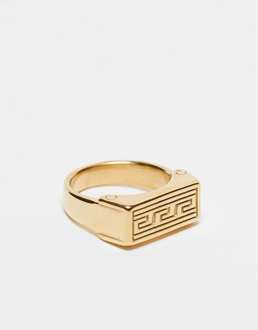 ASOS DESIGN waterproof stainless steel engraved Greek wave rectangular signet ring in gold tone