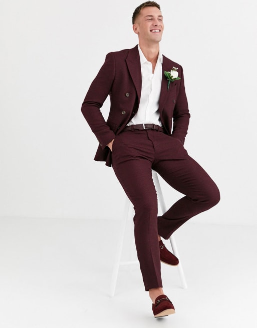ASOS DESIGN wedding skinny double breasted suit in micro texture in burgundy