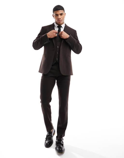 ASOS DESIGN wedding slim wool mix suit jacket in dark brown basketweave texture