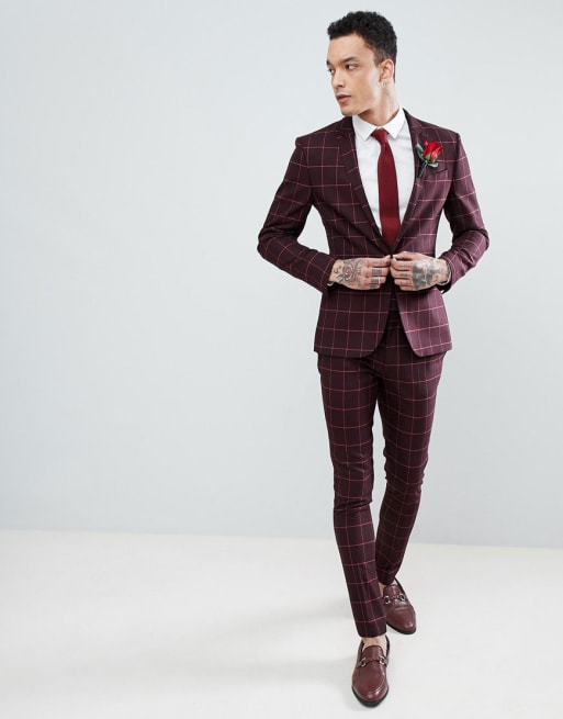 ASOS DESIGN Wedding Super Skinny Suit In Wine And Orange Grid Check