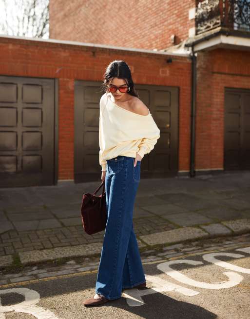 ASOS DESIGN wide leg jeans with front pockets in dark mid blue