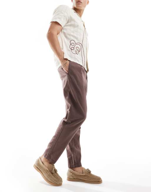 ASOS DESIGN wide pleated linen chino pants in brown