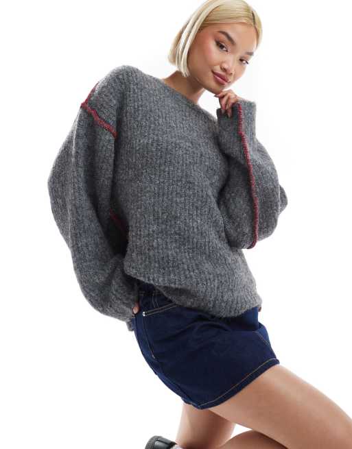 ASOS DESIGN wool look knitted jumper with red blanket stitch seams in grey