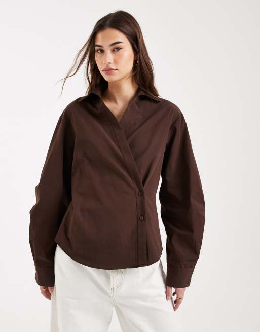 ASOS DESIGN wrap shirt with cocoon sleeve in chocolate