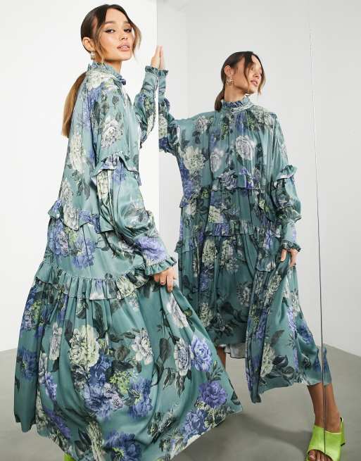 ASOS EDITION button front smock midi dress with tiered ruffles in floral print