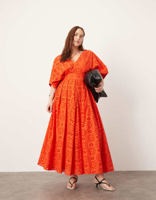 ASOS EDITION Curve broderie wide sleeve plunge midi dress in red