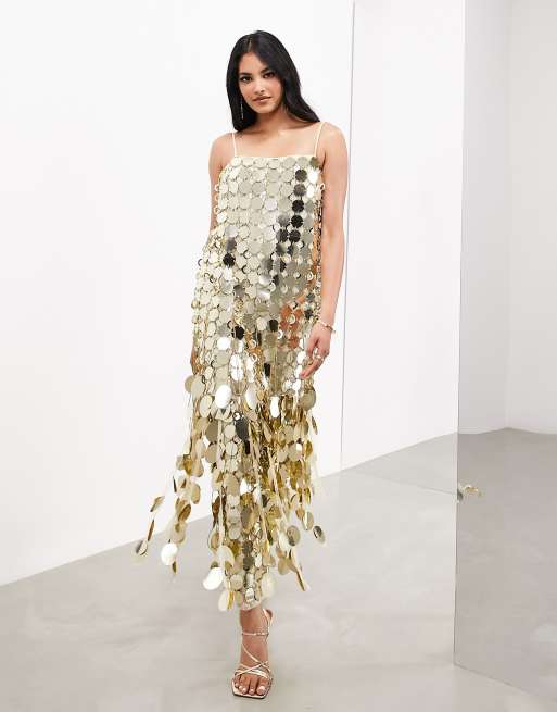 ASOS EDITION Futurist sequin cami column midaxi dress with 3D fringe in gold