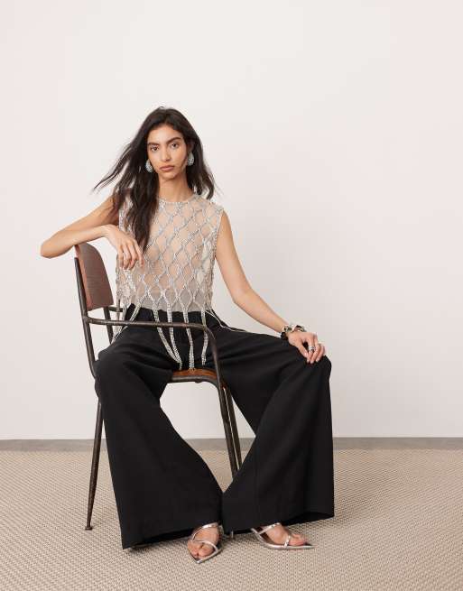 ASOS EDITION hand embellished crystal fringe top in silver
