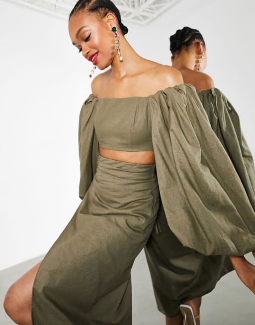 ASOS EDITION khaki off-the-shoulder crop top and midaxi skirt split co-ord