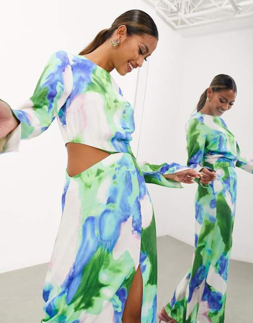 ASOS EDITION satin long sleeve cut out midi dress in green watercolour print