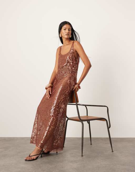 ASOS EDITION sheer disc sequin maxi raw edge singlet dress in chocolate