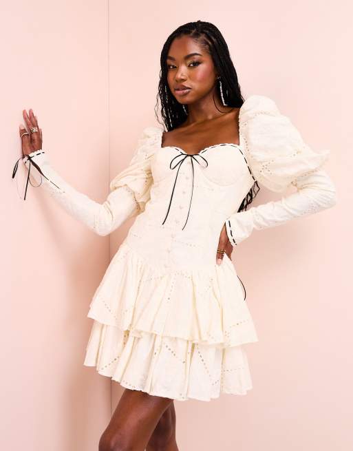 ASOS LUXE broderie corsetted mini dress with black tie detail in white