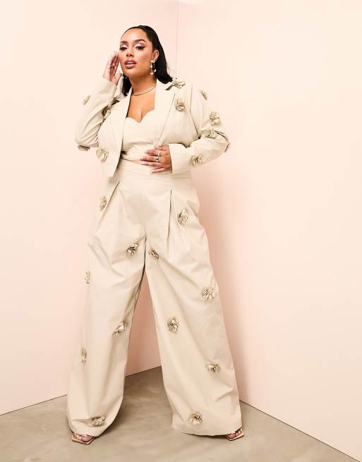 ASOS LUXE Curve 3D flower high waist wide leg pants in stone (part of a tri-set)