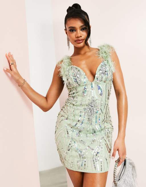 ASOS LUXE embellished gemstone mini dress with faux feathers in mint