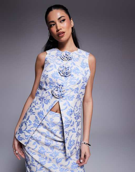 ASOS LUXE jacquard waistcoat with 3D flowers in blue tapestry floral (part of a set)