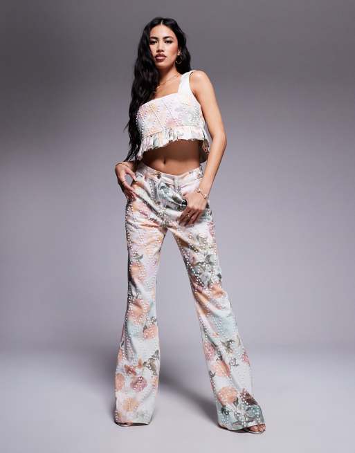 ASOS LUXE pearl embellished peplum printed denim top and jeans in rose print