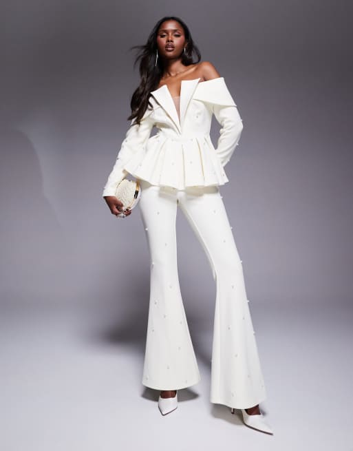 ASOS LUXE tailored pants with pearl embellishment in cream (part of a set)