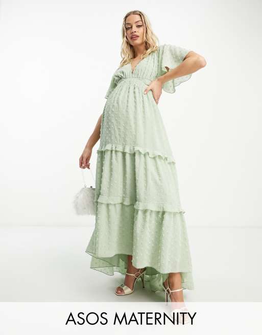 ASOS DESIGN Maternity angel sleeve plunge dobby tiered maxi dress with cut out and rouleaux detail in sage