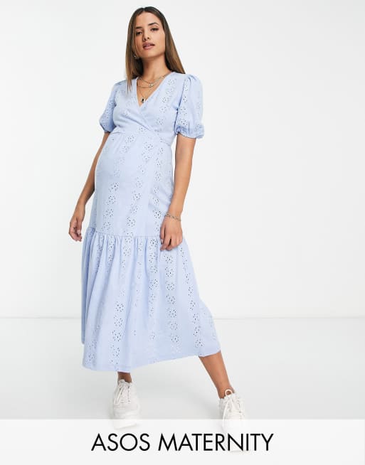 ASOS DESIGN Maternity broderie short sleeve tiered wrap midi dress in cornflower blue