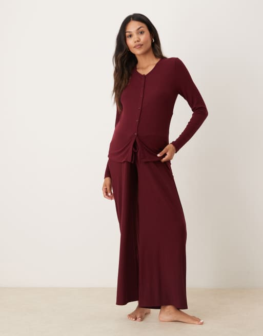 ASOS DESIGN Maternity lounge mix & match rib wide leg pants in burgundy
