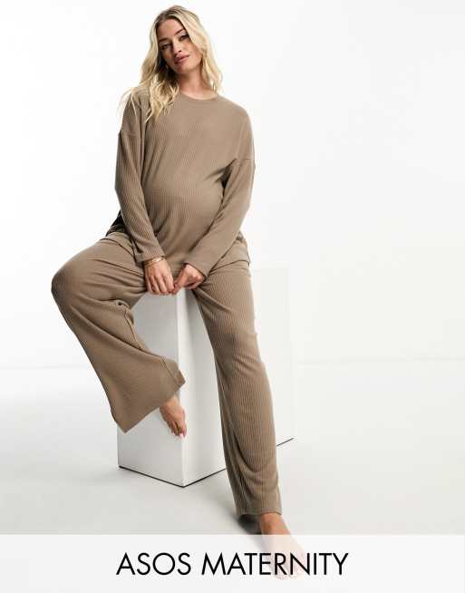 ASOS DESIGN Maternity lounge soft touch rib sweat & pants set in brown