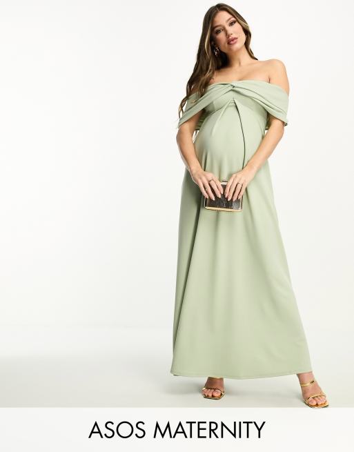 ASOS DESIGN Maternity off shoulder twist bardot maxi dress in sage
