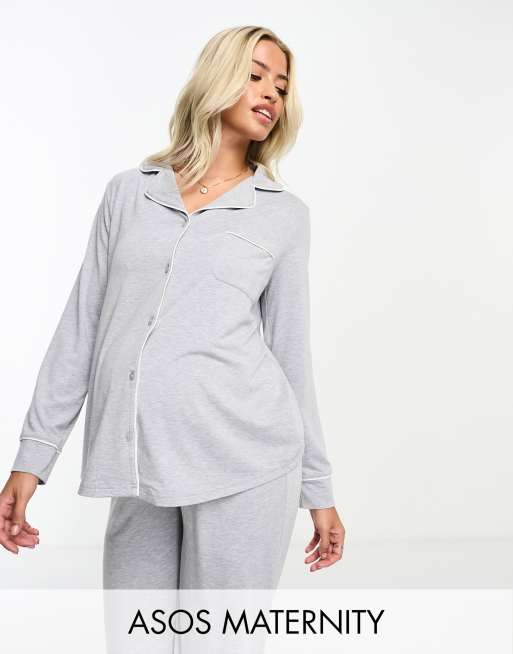 ASOS DESIGN Maternity soft jersey long sleeve shirt & pants pyjama set with contrast piping in grey marl