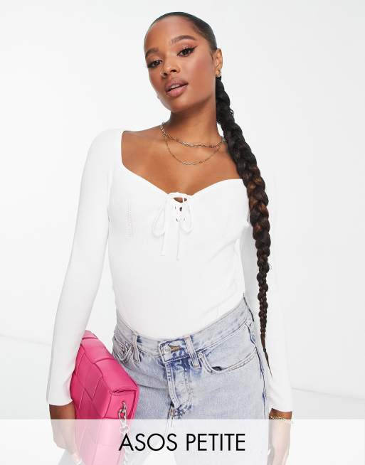 ASOS DESIGN Petite knitted top with sweetheart neck and lace up front detail in white