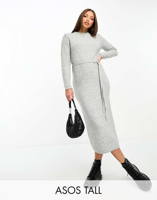 ASOS DESIGN Tall knitted midi dress with tie waist in grey
