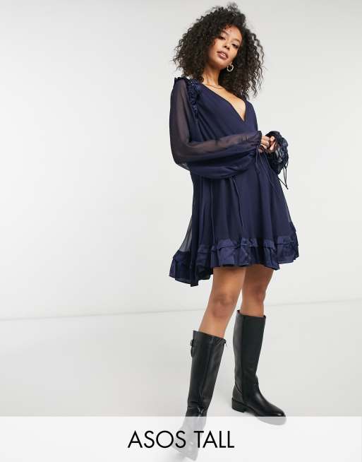 ASOS DESIGN Tall mini dress with satin trim ruffle and tie detail in navy