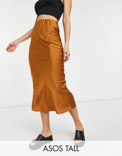 ASOS DESIGN Tall satin bias slip midi skirt in tan