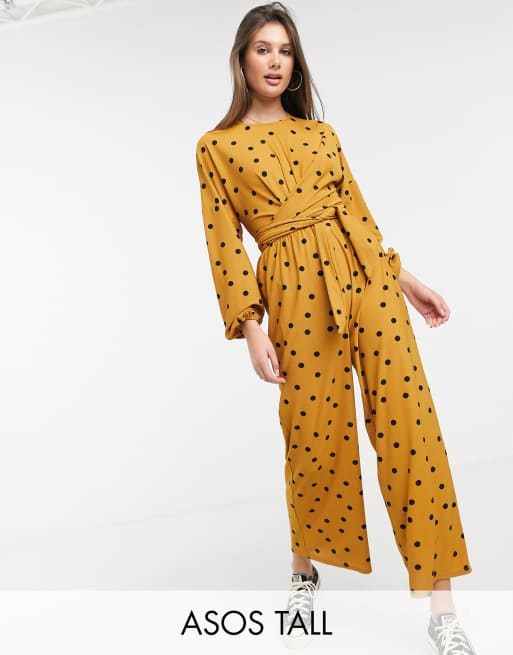 ASOS DESIGN Tall stretch x-front wrap long-sleeved jumpsuit in brown spot print