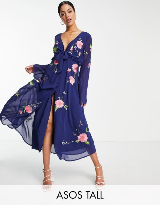 ASOS DESIGN Tall tie front button through midi dress with floral embroidery in navy